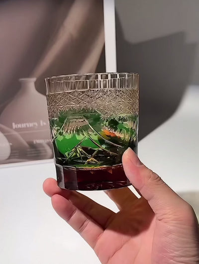 The Emerald Mount Fuji whisky glass doesn't ask for attention—it commands it. Precise hand-cut patterns echo Mount Fuji's majestic slopes, the iconic peak rising in vibrant emerald green tones reminiscent of lush forests and spring vitality. Crowned with delicate asanoha (hemp leaf) and cherry blossom motifs, the base radiates with brilliant amber starburst patterns. As light passes through the crystal, reflections shift and dance, transforming each drink into a luminous tribute to nature's splendor and spiritual symbolism. This isn't decoration. It's reverence carved in glass, designed to turn your nightly pour into something worth pausing for.