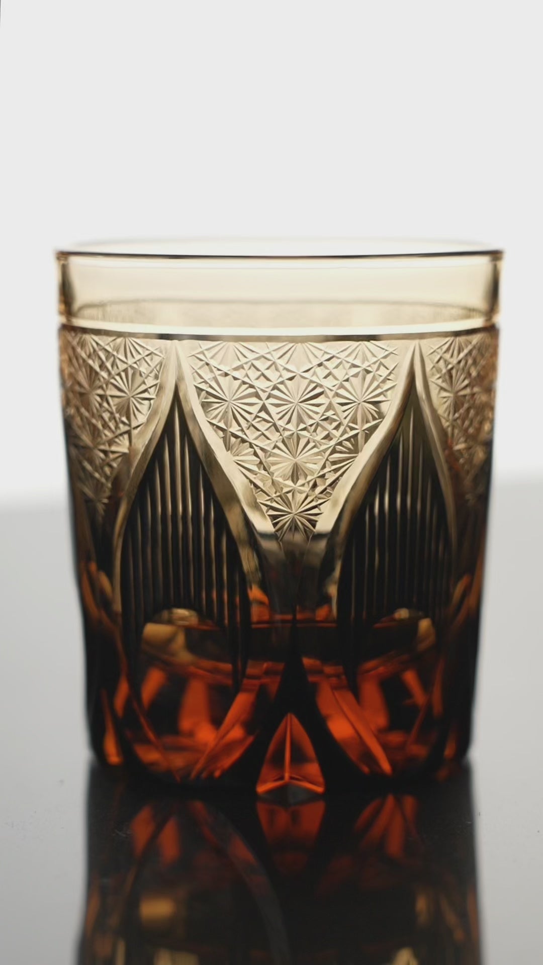 The Candle Flame design rises gracefully along the glass, its hand-carved patterns resembling flames that dance in stillness. Each cut, executed with masterful precision, refracts brilliance into shimmering waves, casting radiant reflections across the crystal surface. The interplay of deep amber tones and golden light transforms the vessel into more than a glass—it becomes a living ember, glowing softly in the palm of your hand. The faceted base amplifies light into a kaleidoscope of brilliance, while the balanced weight and refined form provide both tactile luxury and visual splendor. When guests see this on your bar, they don't just notice beauty—they recognize taste and appreciation for symbolic artistry.