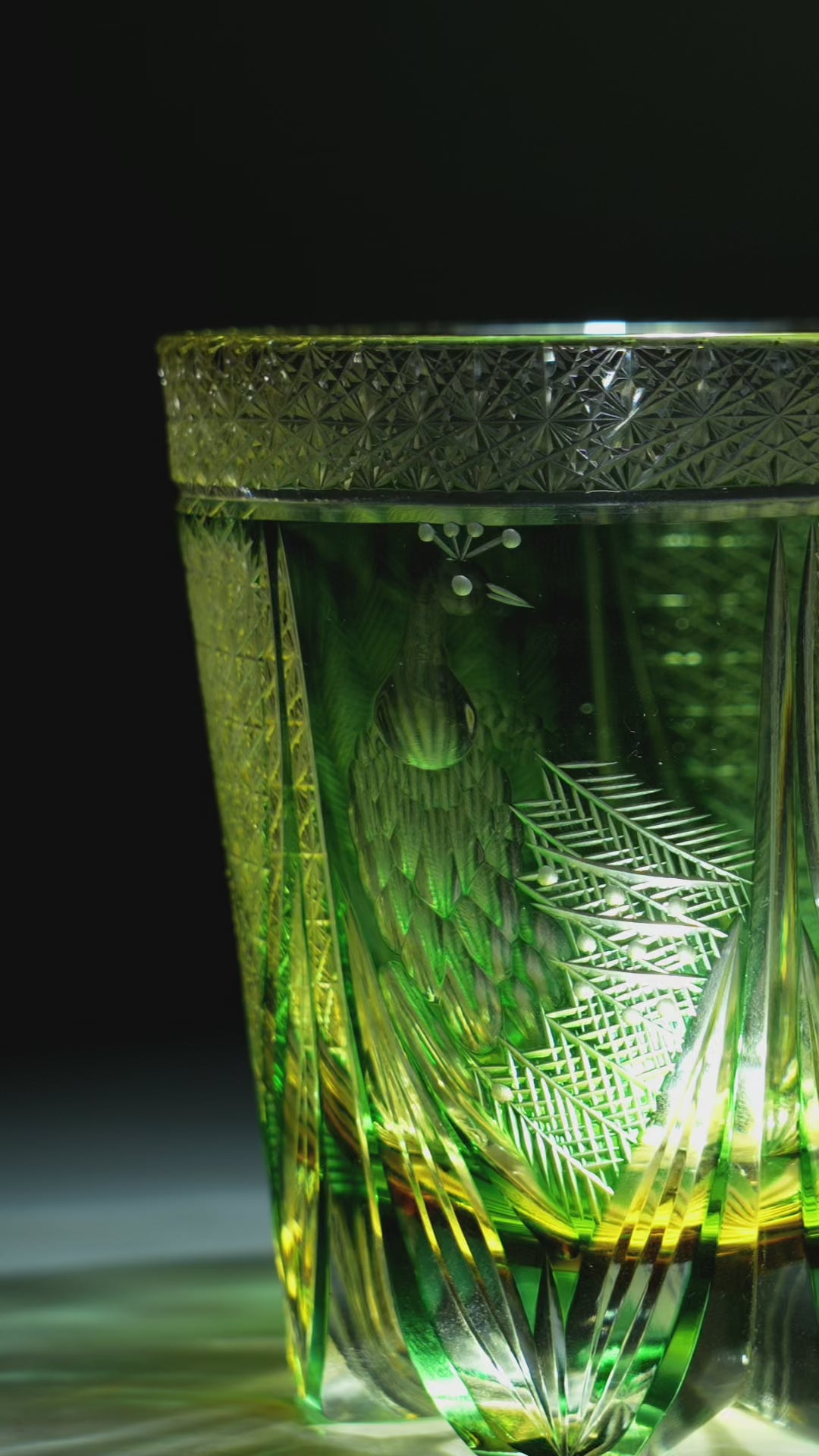 Edo Kiriko Emerald Peacock Whisky Glass – Hand-Carved Premium Crystal Glass | Opulent Beauty