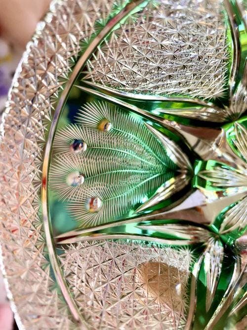 Edo Kiriko Hand-Carved Emerald Peacock Whiskey Glass – A Verdant Gem of Japanese Artistry