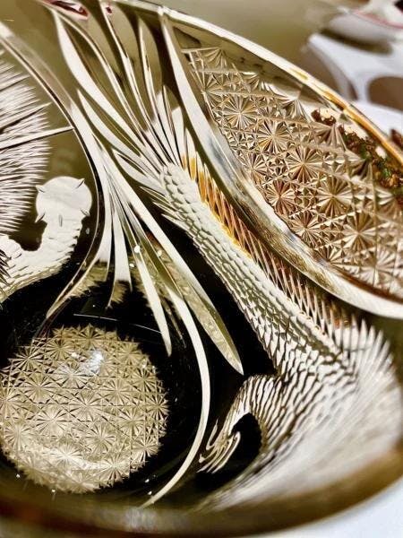 This is followed by a phase of exquisite refinement. The same cuts are revisited with a finer-grit wheel, allowing for the precise sharpening of each line and the addition of the delicate, intricate motifs that are the hallmark of traditional Edo Kiriko.