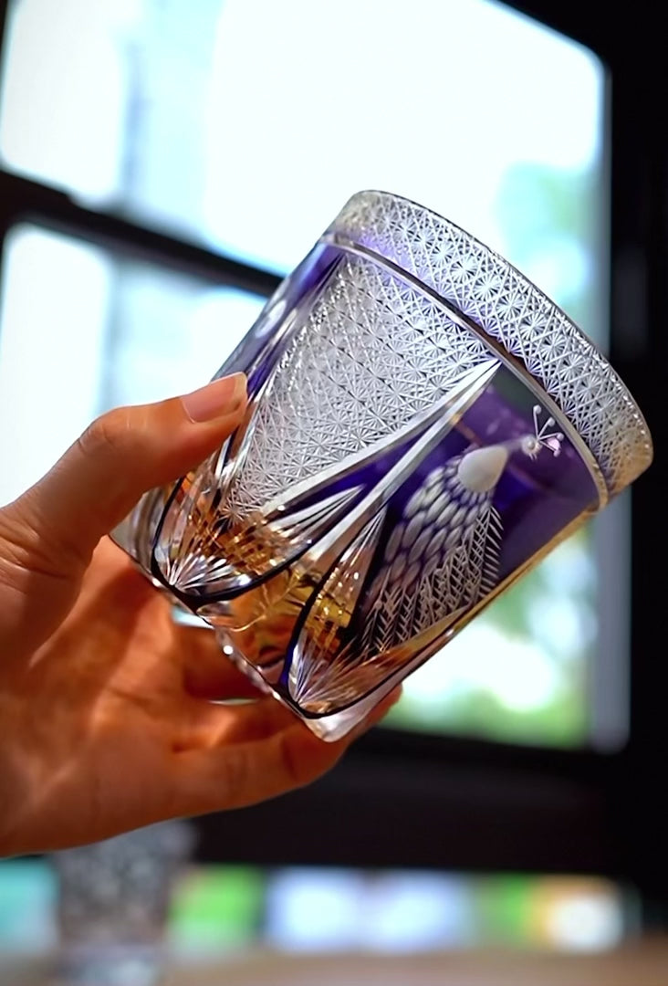 Edo Kiriko Hand-Carved Violet Peacock Whiskey Glass – A Royal Bloom in Crystal